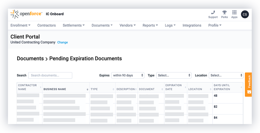 Better visiblity of pending document expirations in Openforce is great for ongoing monitoring when you are in and out of the platform, but it may be helpful to have a consolidated view land in your inbox—or sent to other stakeholders. Starting June 1, users who are assigned a “compliance” role in Openforce, will automatically receive a monthly report of all documents expiring within the next 90 days, including the contractor information, document type and name, and the exact expiration date.