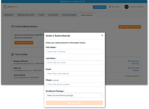 Once a Master logs in to Openforce, they’ll see a new, mobile-friendly “Subcontractors” tab. From there they can easily invite subcontractors on desktop or mobile by entering some basic information and selecting the enrollment package from a dropdown menu.