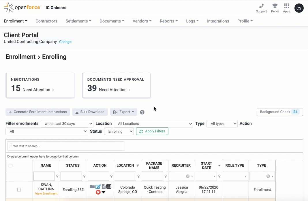 To fix this, we’re adding some easy-to-use dropdown filters right above the contractor and enrollment grids. You can filter by date (we’ll automatically filter to the last 30 days for enrollments), location, enrollment type, action and status. All you need to do is select from the dropdowns and click the “Filter results” button.