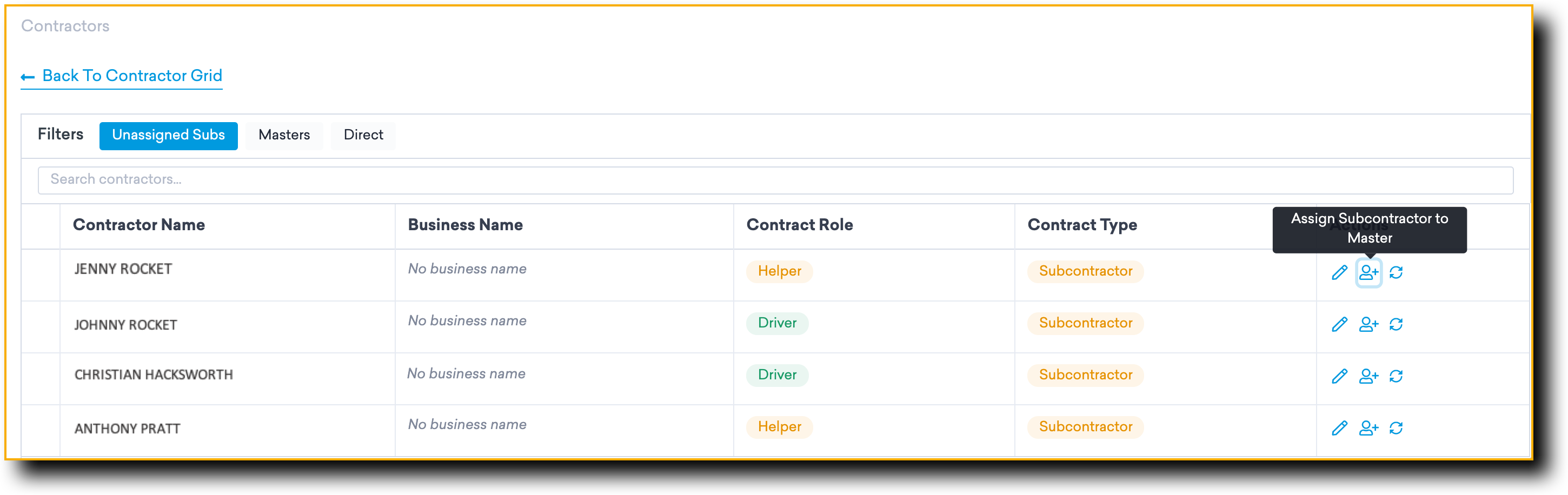 - Easy-to-read, color-coded contract role types for masters, directs, and subcontractors